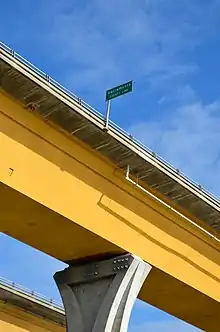 Following the I-5 junction, US 50 runs on a freeway section commonly referred to as the WX Freeway[3] due to it being flanked by the parallel one-way W & X Streets, along the south side of Downtown Sacramento. This part of the freeway is also built upon a raised embankment, to allow the many city streets to pass under it. The route then hits an interchange with a crossing freeway where Business 80 is the route heading north, and SR 99 is the route heading south.