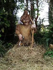 The Trauco is a mythical entity that inhabits the woods of Chiloé, an island in the south of Chile. It is a child of the snake god Coi Coi-Vilu.[1] It has a powerful magnetism that attracts young and middle-aged women. According to myth, the Trauco's wife is the wicked and ugly Fiura.[1][2] The Trauco carries a small stone-headed hatchet that he uses to strike trees in the forest to symbolize his sexual potency.