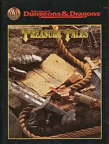 Treasure Tales is a collection of 16 short adventure scenarios for AD&D.[1] Each adventure includes information for players, notes for the Dungeon Master, a map, and a picture for setting the scene. The page for the player presents the setting for the adventure along with its legends and notable characters, while the page for the DM explores each map and describes the primary enemies and which treasures are found in which locations.[1]