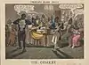 Of the twelve cartoons in Tregear's initial series, Summers designed and drew nine, two were reissues of Clay cartoons redrawn by Summers (from Isaacs), and Charles Hunt engraved all eleven as lithographs.[2] The last cartoon was credited as "Drawn & Engraved by I. Harris." "I. Harris" is now accepted as a pseudonym for Edward Williams Clay himself.[3] Another eight of the Clay cartoons redrawn by Summers (from Isaacs) were soon reissued to expand the first Tregear series to twenty plates.[4]