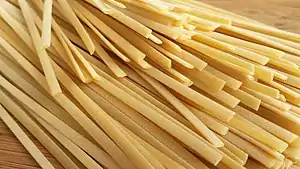 Trenette (Italian: [treˈnette]) is a type of narrow, flat, dried pasta from Genoa, Liguria; it is similar to both linguine and fettuccine.[1][2] Trenette is the plural of trenetta, but is only used in the plural and is probably a diminutive of the Genoese trena 'string'.[3] Trenette is commonly served in the form of pasta served with pesto, a dish known as trenette al pesto, which can also include potatoes and green beans boiled in the same water.[4]