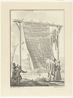 The first to be examined in early September 1618 was Ledenberg. He was hard pressed by his personal enemy the Utrecht fiscal van Leeuwen (according to some with threats of torture, though this was officially denied in a resolution of the States General) and this treatment caused him to commit suicide by slitting his throat with a bread knife on 28 September 1618 (so after two weeks).[43] According to the suicide note in the French language that he left, that was referred to in his verdict, he hoped with this desperate act to halt the trial (a not unreasonable expectation) and thereby to prevent a sentence of forfeiture of his assets.[44] But the judges had his body embalmed and retained it until his "execution" which took place posthumously after his conviction on 15 May 1619[43]