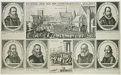 Engraving by Claes Jansz. Visscher, depicting portraits of the defendants around scenes of the executions of Oldenbarnevelt and Ledenberg