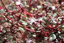 It is an annual herb forming a prostrate mat or clump with stems up to a meter long. It is green to red in color, hairless except for small lines of hairs near the leaves, and fleshy. The leaves have small round or oval blades up to 4 centimeters long borne on short petioles. Solitary flowers occur in leaf axils. The flower lacks petals but has purple, petallike sepals. The fruit is a curved, cylindrical capsule emerging from the stem. It is up to half a centimeter long and has two erect, pointed wings on top, where the capsule opens.