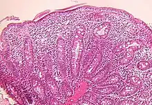 Microscopic examination of a biopsy of the small bowel in these patients shows villous atrophy with low or no mononuclear cell infiltration of the lamina propria nor specific abnormalities involving the epithelium. The amount of villous atrophy does not explain the severity of the diarrhea.