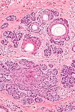 Trichoepithelioma is a neoplasm of the adnexa of the skin.[1] Its appearance is similar to basal cell carcinoma.