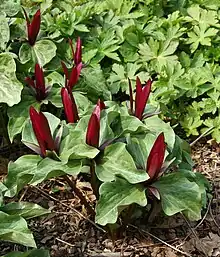 Scape erect, 28–44 cm (11–17 in) long, usually 2.32.5 times as long as the bracts. Bracts sessile, ovate or widely ovate, 11–18 cm (4.3–7.1 in) long, dark green, with tips generally slightly acuminate. Sepals lanceolate, 42–70 mm (1.7–2.8 in) long, diverging, greenish or basally purple. Petals oblanceolate, 65–105 mm (2.6–4.1 in) long, usually 3.34.6 times longer than wide, erect, dark purple (variously referred to as maroon-red, red-purple, purple-red, or lurid purple), underside usually duller than the top. Stamens erect, 16–25 mm (0.63–0.98 in) long; filaments short, dark purple; anther sacs introrse, 14–21 mm (0.55–0.83 in) long, with yellow pollen; connectives prolonged up to 0.5 mm. Carpels approximately 4/5 as tall or equal to the stamens; ovary ovoid, 9–13 mm (0.35–0.51 in) tall, dark purple, a rounded hexagon in cross section; stigmas coarsely subulate, 6–8 mm (0.24–0.31 in) long, erect, dark purple. Flowers have a spicy or musty odor at anthesis, sometimes becoming fetid with age. Fruit dark reddish purple, ovoid to ellipsoid, weakly angled, 20–50 mm (0.79–1.97 in), fleshy.[5][6][7]