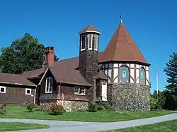 The church structure is a rectangular frame church of three bays with shingled walls and on the east end, a semi-octagonal apse of stone. Major additions to the original structure took place ca. 1890.[6]