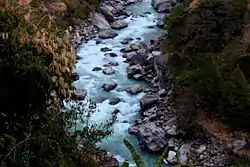 Even though the Trishuli river is physically formed at the Rasuwa Fort,[5] it is not officially called so at this stage. It is referred to by the generic name of "Bhot Koshi" ("the river from Tibet"). It is called Trishuli Ganga after receiving the Trisuli Khola stream originating in Gosainkunda near Dhunche.[6] This would make Gosainkunda the official source of the river, and the river from Tibet a tributary.