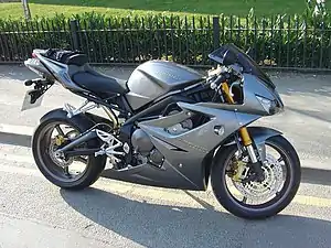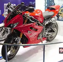 Introduced in 2006, the Triumph Daytona 675 is a three-cylinder sport bike, and the smallest of the Triumph triples. Built by Triumph Motorcycles, it replaced their four-cylinder Daytona 650. The 675 proved to be remarkably light, nimble and powerful; at a maximum of 128 bhp it was also very quick, and it was very successful against the Japanese 600 cc competition. In 2016, Triumph ceased production of the base model Daytona 675 citing diminishing demand for super sport bikes and increasingly strict European emission standards.[1] Triumph continued to produce the up-spec Triumph Daytona 675R model until the 2018 model year.[2][3] Triumph filed a new trademark for the Daytona, fuelling rumors that there may be a future version sporting the new 765 cc engine.[4][5]