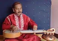 After inventing Ranjan Veena he researched with various instruments to come up with a unique instrument. It was named Triveni Veena, (Triveni meaning three rivers[2]) because it combines 3 materials (metal, wood and leather) and produces mixed tone of 3 instruments (Sarod, Veena and Guitar [1]). There are 4 melody strings, 2(right) + 4(left) Chikari strings to maintain Scale with Rhythm and 11 sympathetic strings. It is medium in size but produces a loud sound with long sustenance and sweet tone. It is played using a steel slide just like Hawaiian Guitar. On the Triveni Veena, an experienced musician, can play all the Indian Classical Instrumental techniques –Meed (Slide) Gamak, Krintan, Gitkari etc. and the fast Taans too.