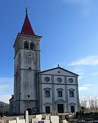 The church in Trnovo is dedicated to Saint Peter. It was originally a medieval structure that has been remodeled several times, with the chancel in the Gothic style. The church has external buttresses, a rectangular nave, and a bell tower next to the north wall. The interior was rearranged and painted by Tone Kralj in 1960–61. The church is located on a hill with a cemetery south of Trnovo.[7]