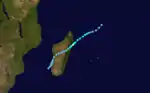 On January 22, a tropical disturbance formed to the southeast of Diego Garcia.[13] It moved generally to the west-southwest, intensifying into a tropical storm on January 23. That day, the Mauritius Meteorological Services named the storm Doaza,[14] and the JTWC classified it as Tropical Cyclone 09S.[2] On January 25, Doaza passed north of Tromelin Island,[14] and around that time it attained an initial peak of 80 km/h (50 mph).[13] Later that day, the storm struck eastern Madagascar near Île Sainte-Marie, and it quickly weakened over land,[14] so much so that the JTWC discontinued advisories.[2] However, Doaza emerged into the Mozambique Channel on January 26 near Mahajanga and soon after reorganized while curving to the south.[14] The JTWC again issued advisories on January 28,[2] around which time Doaza passed just southeast of Juan de Nova Island. On the next day, the storm attained tropical cyclone status, reaching winds of 135 km/h (84 mph) just west of Europa Island. On January 30, the JTWC estimated peak 1 minute winds of 215 km/h (134 mph), by which time the storm was moving due southward.[13] Doaza turned to the southeast and quickly weakened, dissipating within the westerlies on February 1.[14]