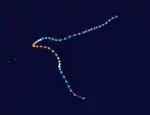 After a period of inactivity lasting a month, the final storm of the season began forming on May 4 between Agalega and Diego Garcia.[28] Two days later, the system developed into a tropical disturbance,[29] although it initially consisted of just a circulation without any organized convection.[28] It moved to the northwest at first before turning sharply to the south on May 7, slowly intensifying. On May 9, the system intensified into a moderate tropical storm with peak 10 minute winds of 65 km/h (40 mph).[29] That day, the Mauritius Meteorological Services named it Iarisena,[28] and the JTWC classified it as Tropical Cyclone 20S.[2] A cold front steered the storm to the southeast. On May 10, Iarisena lost what little organized convection it had, leaving behind an exposed circulation as it weakened to tropical depression status. Thunderstorms briefly rebounded on the next day before diminishing again. The circulation became difficult to locate within the broad area of thunderstorms.[28] It turned back to the north and dissipated on May 14, about 700 km (430 mi) southeast of where it formed.[29]