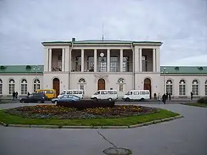 Tsarskoye Selo railway station (Russian: станция Царское Село) is a railway station located in Pushkin, Saint Petersburg, Russia. It is 23 km down-line from Vitebsky railway station and is situated between Shushary and Pavlovsk on the Saint Petersburg – Vitebsk line. The station hosts suburban trains from Saint-Petersburg, Novolisino, Posyolok, Oredezh, Luga and Veliky Novgorod. Electric trains ED4M, ER2T and DT1 make passenger trips from Tsarskoye Selo station. Long-distance trains do not stop at Tsarskoye Selo station except for trains from Velikiye Luki. The station is approximately 1 km from the town center. It has official status as an object of Russian cultural heritage.[2]