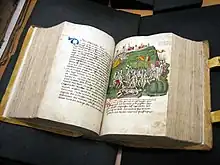 It consists of a paper manuscript including some 230 coloured illustrations, most of them full page. Two hundred of the illustrations show war scenes; the remaining show everyday life, both rural and in towns, and also scenes in the royal court. In the epilogue, the two authors declare that the work was finished in 1470.