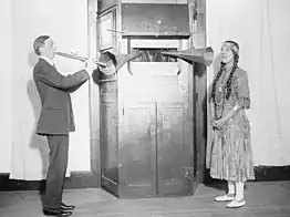 She collaborated with Cadman and his librettist Nelle Richmond Eberhart in creating the opera Shanewis (or The Robin Woman). Its contemporary plot was loosely based on Redfeather's semi-autobiographical stories of Native American life, and was set in California and Oklahoma.[8] The work debuted at the Metropolitan Opera in 1918 and was performed also the next season. Highly popular, it toured the United States. Tsianina sang the lead at some performances on tour, making her opera debut in the role in Denver in 1924.[9] She reprised it in 1926 at the Hollywood Bowl in Los Angeles.[10]