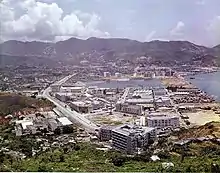 Development of the Tsuen Wan satellite town commenced in the 1950s, along with Kwun Tong satellite town. In 1961, the government of Hong Kong decided to expand the satellite town into neighbouring Kwai Chung and Tsing Yi, and Tsuen Wan New Town was established as the first new town in Hong Kong. In 1982, the Tsuen Wan District was created under the District Administration Scheme. In 1985, with the explosion of population in the new town, Kwai Chung and Tsing Yi were spun off to form the new Kwai Tsing District. Thus, the town is now under two administrative districts. In some recent official reports, Kwai Chung New Town and Tsing Yi New Town are separated from Tsuen Wan New Town.[2]