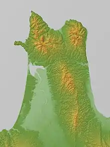 The Tsugaru Peninsula (津軽半島, Tsugaru Hantō) is a peninsula in Aomori Prefecture, at the northern end of Honshū island, Japan. The peninsula projects north into the Tsugaru Strait separating Honshū from Hokkaidō. The western coast is on the Sea of Japan, while on its eastern coast are Aomori Bay and Mutsu Bay. The peninsula is bisected from Cape Tappi at its northern end to the Hakkōda Mountains on its southern end by the Tsugaru Mountains. Across the Tsugaru strait to the north is Hokkaidō's Matsumae Peninsula, to which it is linked by the Seikan Tunnel.[1][2]