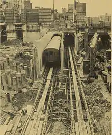 In September 1968, the MBTA began construction of the shell of a station - then called South Cove - and the South Cove Tunnel during what were to be the early stages of the abandoned Interstate 695 project, in anticipation of the future relocation of the Washington Street Elevated.[8][1] The relocated Orange Line was to run in the median of the extended I-95 in the Southwest Corridor, then replace service on the Needham Line to Needham. Due to a lack of available federal funds, the MBTA financed the $13.3 million project with local bond funds. The tunnel (which reached to Marginal Street) and the station shell were completed in 1972.[8][9] However, I-695 was cancelled due to local opposition in 1971; the Elevated remained in service, and the South Cove Tunnel and station sat unused.