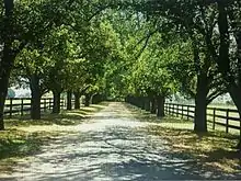 A key landscape element is a driveway, which is lined with an avenue of 51 Elms down each side. They are mature from the gates through to the 28th tree, and semi-mature after that indicating two stages of planting. The size of the more mature specimens suggests an original planting date of around 1900. About 10 of the trees are recent in-fill sapling plantings. Other related landscape elements are several cypresses (Cupressus Macrocarpa) which appear to have been planted in the early twentieth century as a wind-break, and there are more mature Cypress windbreaks in the surrounding paddocks. These vary in maturity and appear to date from the early to mid-twentieth century.