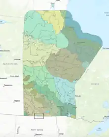 Turtle Mountain Provincial Park is situated on the Turtle Mountain (plateau), one of a number of significant geographic features located along the Manitoba Escarpment, the Canadian portion of the Pembina Escarpment. It is located in the Southwest Manitoba Uplands Ecoregion, within the Canadian Prairies.[9] The park is situated at an elevation of 245 metres.[10] This region is covered by glacial till and fluvioglacial deposits, which remain from the pleistocene ice age.[9] A study of dinoflagellates confirmed the paleocene age of the Turtle Mountain formation.[11] Once deglaciation finished 14,000 years ago the irregular melting pattern left the area covered in hummocky terrain.[6] The soils are mainly grey and black chernozems.[9] There are grey luvisols at higher elevations.[9] The bedrock in the park is composed of sandstone, shale, lignite coal.[6] There are over 200 lakes and wetlands in this region.[10] Many of the shorelines are covered in thick vegetation due to the littoral zone cattails.[6] This park is home to the largest oak trees in Manitoba, which are the lone survivors of a fire that occurred in the early 20th century.[2] Many of the water bodies are less than 15 feet deep, which often results in a winter decline in fish populations due to lack of oxygen.[6]