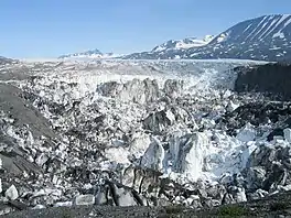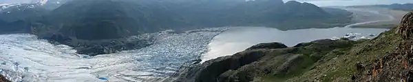The Tustumena Glacier is a glacier located on the Kenai Peninsula of Alaska. The Tustumena Glacier begins in the Harding Icefield and makes its way down west for about 20 miles (32 km) until its terminus roughly 5 miles (8.0 km) before Tustumena Lake. The glacier is retreating[1] due to global warming.