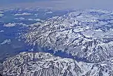 Aerial view of Yosemite's north country, from the north, with Twin Lakes barely visible in the canyon through the haze, and Mono Lake in the background
