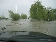 On May 31 , strong winds from the northwest which reached at times over 100 km/h occurred on Lake Manitoba, causing waves as high as 7 feet (2.1 m) which resulted in major flooding at Twin Lakes Beach and the surrounding beaches such as Laurentia Beach and Sandpiper Beach, as well as other locations on the lake including Delta Beach and St. Ambroise.[28] The strong wind caused water from the north basin of Lake Manitoba to transfer to the south basin causing lake to surge (seiche effect) from 816.29 feet (248.81 m) above sea level in the morning to an estimated level of 820.37 feet (250.05 m) above sea level, a rise of over 4 feet (1.2 m).[21][29] The result was overland flooding occurring on property and roads as well as damage to residences. Mandatory evacuations were ordered by the Rural Municipalities of Woodlands and St. Laurent to all cottagers and permanent residents on Twin Lakes Beach.[30] Many cottages and homes were damaged and destroyed as a result of the storm. While the community remained under mandatory evacuation orders, structural experts were brought into the Twin Lakes Beach area to inspect every building on each property to assess the structural integrity of them and determine whether or not each building was structurally sound, and whether or not residents would be able to enter their homes and cottages.[31] Buildings were rated on a scale of level of destruction from 1 to 4 with 4 being the worst, meaning that the building cannot be rehabilitated, cannot be entered, and must be demolished.[32]