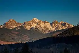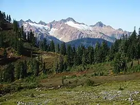 Twin Sisters Mountain (Nooksack: Kwetl’kwítl’ Smánit, "red mountain"),[3] commonly called the Twin Sisters, is a mountain in the U.S. state of Washington. Part of the Cascade Range, it lies just southwest of Mount Baker. Of its two main peaks, South Twin is higher, with a summit elevation above 7,004 feet (2,135 m).[lower-alpha 1][1] The summit of North Twin is above 6,644 feet (2,025 m).[lower-alpha 2][4] There are several glaciers on the northeast slopes of Twin Sisters Mountain.