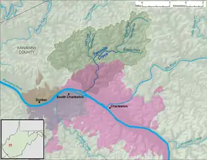 Twomile Creek is a tributary of the Kanawha River, 4.7 miles (7.6 km) long,[5] in West Virginia in the United States. Via the Kanawha and Ohio rivers, it is part of the watershed of the Mississippi River, draining an area of 24.4 square miles (63 km2)[6] on the unglaciated portion of the Allegheny Plateau, in the city of Charleston and its vicinity.