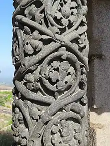 The Tyagada Brahmadeva Pillar (or Chhagada Brahmadeva Pillar) is a decorated free standing pillar (lit, Stambha), 2.3 m tall, commissioned by Chamundaraya, an important minister and commander in the Western Ganga kingdom, during the rule of King Marasimha II (963–975), Rachamalla IV (975–986) and Rachamalla V.[1][2] The pillar dates to around 983 C.E. and exists on the Vindyagiri hill (called Dodda Betta in local Kannada language) in the important Jain heritage town Shravanabelagola, in the Karnataka state, India.[3] On the base of the pillar, on the north side, is an inscription in old Kannada language of the same period,[4] which according to epigraphist and historian B.L. Rice confirms Chamundaraya's involvement in the erection of the pillar.[5][6] Free standing pillars are a characteristic feature of the Western Ganga art and are broadly classified as "Mahastambha" (or "Manastambha", "Indrastambha") and "Brahmastambha".[3][7]