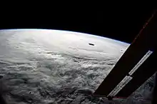 Once Typhoon Vongfong entered the Philippine Area of Responsibility shortly after 06:00 UTC on October 7, the PAGASA named it Ompong.[6] The system started to undergo rapid deepening early on that day, owing to low vertical wind shear and multiple outflow mechanisms including a TUTT cell positioned to the east. The JTWC upgraded it to a super typhoon at noon, as the system had formed a 40 km (25 mi) round eye surrounded by a symmetric annulus of intense convection.[7] Vongfong reached peak intensity six hours later, when the system's T-number of the Dvorak technique had increased to 7.5 according to both of the JMA and the JTWC, becoming the first tropical cyclone to reach that status since Haiyan in 2013. As the result, the JMA indicated that the maximum ten-minute sustained winds had increased to 215 km/h (134 mph) and the system's atmospheric pressure had dropped to 900 hPa (27 inHg).[8] The JTWC also indicated that Vongfong had become equivalent to a Category 5 hurricane on the Saffir–Simpson hurricane wind scale, with maximum one-minute sustained winds at 285 km/h (177 mph). Additionally, although the typhoon was still generally tracking westward, it noticeably slowed down due to the weakening subtropical ridge.[26]