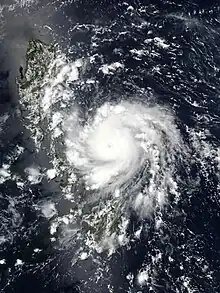 Vongfong's cloud tops were rapidly cooling and consolidating upon its upgrade to a tropical storm, indicative of a strengthening cyclone.[15] The storm also began to develop anticyclonic outflow and curved rainbands.[16] A well-defined eye soon emerged on microwave satellite imagery as the storm's structure became further organized,[17] surrounded by hot towers with the storm tracking nearly due west in response to a subtropical ridge centered over the Northern Mariana Islands.[18] At 06:00 UTC on May 13, the JMA upgraded Vongfong to severe tropical storm status,[19] followed by an upgrade to typhoon status six hours later.[20] The eye became increasingly pronounced and contracted to less than 10 km (6.2 mi) in diameter as the storm's evolution became suggestive of rapid intensification.[21][22][23] The JTWC assessed 1-minute sustained winds of 195 km/h (121 mph) at 21:00 UTC on May 13 shortly before the onset of an eyewall replacement cycle;[24] nine hours later, the JMA analyzed Vongfong to have attained 10-minute sustained winds of 155 km/h (96 mph) and a barometric pressure of 965 hPa (mbar; 28.50 inHg).[25] Vongfong made landfall with this intensity over San Policarpo, Eastern Samar, at 04:15 UTC on May 14.[26][27] The storm's structure degraded due to land interaction as it traversed Samar, causing Vongfong's eye to dissipate.[28][29] Vongfong made six additional landfalls as it traversed the remainder of the Visayas into Luzon: Dalupiri Island; Capul Island; Ticao Island; Burias Island; San Andres, Quezon; and Real, Quezon.[30] The prolonged interaction with land caused Vongfong to weaken, though the storm maintained a compact circulation amid otherwise favorable atmospheric conditions.[31][32] On May 15, Vongfong weakened below typhoon status and began to track towards the northwest around the periphery of a subtropical ridge.[33][34] It weakened further to a tropical storm by 18:00 UTC that day.[35] The center moved off Luzon and became dislocated from atmospheric convection over the Luzon Strait the following day.[36] At 09:00 UTC on May 16, the JTWC issued its final warning on the system.[37] Nine hours later, the JMA downgraded Vongfong to tropical depression status.[38] The PAGASA declared Vongfong to have dissipated on May 17 while over the Bashi Channel.[39]