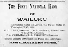 26. "First National of Wailuku". The Honolulu Republican. 20 September 1901. p. 2. Retrieved 17 February 2016 via Newspapers.com. Open access icon