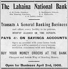 44. "The Lahaina National Bank [Ad]". The Maui News. 31 March 1906. p. 2. Retrieved 20 February 2016 via Newspapers.com. Open access icon