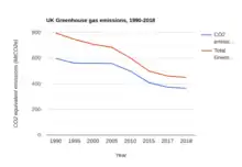 Graph of CO2 and total greenhouse gas emissions in the UK, 1990–2018, data from Department for Business, Energy and Industrial Strategy.[36]
