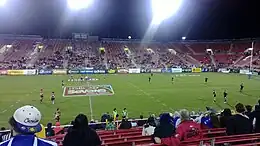 Las Vegas then won the right to host the annual event beginning in 2010, beating out competition from San Francisco, Phoenix, and Orlando.[29] In 2015, World Rugby reached an agreement with USA Rugby and with the tournament's organizers: World Rugby would continue to place the USA Sevens tournament in Las Vegas if the tournament organizers agreed to widen the field at Sam Boyd Stadium and install approved artificial turf.[30]