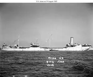 ![]() SS Acme at anchor, 19 August 1943, location unknown, shortly before being acquired by the USN. | |