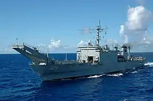 USS Cayuga (LST-1186) was a Newport-class tank landing ship of the United States Navy which replaced the traditional bow door-design tank landing ships (LSTs). The vessel was constructed by the National Steel and Shipbuilding Company in San Diego, California and was launched in 1969 and commissioned in 1970. Cayuga took part in the Vietnam War and Gulf War in American service. Decommissioned in 1994, the LST was transferred to the Brazilian Navy the same year on loan and renamed NDCC Mattoso Maia (G 28). The ship was purchased by Brazil outright in 2001. Mattoso Maia took part in MINUSTAH before being taken out of service in 2023.