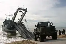 The Newport class were larger and faster than previous LSTs and were able to transport tanks, heavy vehicles and engineer groups and supplies that were too large for helicopters or smaller landing craft to carry.[8] The LSTs have a ramp forward of the superstructure that connects the lower tank deck with the main deck and a passage large enough to allow access to the parking area amidships. The vessels are also equipped with a stern gate to allow the unloading of amphibious vehicles directly into the water or to unload onto a utility landing craft (LCU) or pier. At either end of the tank deck there is a 30 ft (9.1 m) turntable that permits vehicles to turn around without having to reverse.[3][4] The Newport class has the capacity for 500 long tons (510 t) of vehicles, 19,000 sq ft (1,800 m2) of cargo area and could carry up to 431 troops.[3][9] The vessels also have davits for four vehicle and personnel landing craft (LCVPs) and could carry four pontoon causeway sections along the sides of the hull.[4][5]