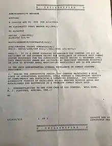 - Meritorious Unit Commendation, for service with the Kitty Hawk battle group, November 1992 to April 1993.[35]