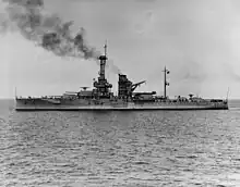 On 22–24 April, the German High Seas Fleet sortied to intercept one of the convoys in the hope of cutting off and destroying the escorting battleship squadron.[8] Florida and the rest of the Grand Fleet left Scapa Flow on 24 April in an attempt to intercept the Germans, but the High Seas Fleet had already broken off the operation and was on its way back to port.[9] On 30 June, the 6th Squadron was cruising in the North Sea in support of a mine-laying operation; while on patrol, Florida and several other ships fired on what they incorrectly believed to be U-boat wakes.[10] By early November, the Spanish Flu pandemic had spread to the Grand Fleet; Florida was the only ship of the American contingent not to be quarantined for the virus.[11] On 20 November, Florida and the rest of the Grand Fleet rendezvoused with the High Seas Fleet, which was then interned in Scapa Flow, following the Armistice with Germany that ended the war.[2] Shortly thereafter, Florida was replaced with the newly commissioned Nevada.[12]