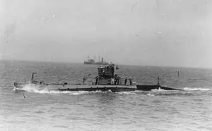 For surface running, they were powered by two New London Ship & Engine Co. 475-brake-horsepower (354 kW) diesel engines, each driving one propeller shaft. When submerged each propeller was driven by a 170-horsepower (127 kW) Electro Dynamic Co. electric motor. They could reach 14 knots (26 km/h; 16 mph) on the surface and 10.5 knots (19.4 km/h; 12.1 mph) underwater.[1] On the surface, the boats had a range of 2,300 nautical miles (4,300 km; 2,600 mi) at 11 knots (20 km/h; 13 mph) and 100 nmi (190 km; 120 mi) at 5 knots (9.3 km/h; 5.8 mph) submerged.[2]