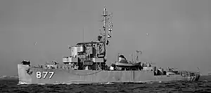 The PCE-877 was commissioned on 14 February 1944 at the Albina Engine & Machine Works shipyard, Portland, Oregon. According to the U.S. Navy Muster Rolls, the PCE-877 set out with Commanding Officer Coleman H. Smith, Lieutenant, USNR, Executive Officer John R. Shea, Jr., Lieutenant, USNR, several additional officers and an initial crew of 87. The vessel received its fitting out and shakedown over the next six weeks, departing Portland, Oregon on 25 February 1944, docking in Astoria, Oregon on 26 February 1944, arriving in San Pedro, California (SCTC Terminal Island) on 6 March 1944, before finally arriving at Naval Base San Diego, California on 21 March 1944.[1]