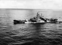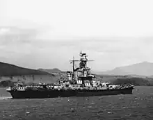 On 14 November, Indiana was assigned as the flagship for Task Group (TG) 2.6, which included the light cruiser Columbia and the destroyers De Haven and Saufley. The four ships then proceeded to Tonga, arriving on the afternoon of 28 November. After refueling, Indiana transferred to TG 66.6 two days later and continued on to Nouméa, arriving on 2 December. There, she took part in exercises with ships from Task Force (TF) 64.[3] The ship served as a replacement for her sister South Dakota, which had been badly damaged during the Second Naval Battle of Guadalcanal; while operating off Guadalcanal, Indiana provided gunfire support to American forces ashore.[7]