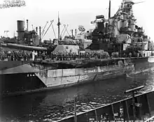 Indiana in dock in Pearl Harbor showing the temporary repairs after the collision with Washington