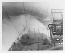 Indiana got underway again in early July and returned to TF 38. She supported carrier strikes on the Tokyo area on 10 July and took part in the first bombardment of the Japanese home islands by capital ships during the war. For the attack, which took place on 14 July, Indiana was assigned to TU 34.8.1, which included Massachusetts and South Dakota, the heavy cruisers Chicago and Quincy, and nine destroyers. The primary target was an industrial complex in Kamaishi that included the Japan Iron Co. and the Kamaishi Steel Works. Indiana fired 271 shells from her 16-inch guns, but smoke hindered the efforts of her spotter aircraft from observing the effects of the shooting, though a destroyer returned the next day and reported that fires were still burning. Indiana then resumed her anti-aircraft support duties with the fast carrier task force until being detached for another bombardment operation with TU 34.8.1 on 29 July. This attack, made in concert with the British TF 37—centered on the battleship HMS King George V—targeted industrial facilities at Hamamatsu. Indiana fired 270 shells during the bombardment.[17]