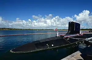 USS Indiana (SSN-789) is a nuclear powered United States Navy Virginia-class attack submarine, named for the State of Indiana. She is the sixteenth of her class and sixth of the significantly redesigned Block III, including a revised bow and VLS technology from the Ohio-class of guided missile submarines.[12] Indiana was constructed by Huntington Ingalls Industries in partnership with the Electric Boat division of General Dynamics in Newport News, Virginia, with the initial contract awarded on 22 December 2008. Her keel was laid on 16 May 2015[1] and she was launched on 9 June 2017.[2] The boat was christened on 29 April 2017 and sponsored by Diane Donald, wife of Admiral Kirkland H. Donald, USN (ret).[3] She was commissioned on 29 September 2018 at Port Canaveral, Florida.[6][13]