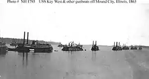 Key West was built in 1862 at California, Pennsylvania, as Key West No. 8; purchased by the Navy from W. S. Evans et al. at Cairo, Illinois, 16 April 1863; and commissioned 26 May, Acting Master E. M. King in command. The wooden stern-wheel steamer departed Cairo that day for patrol duty in the Tennessee River, supporting Union Army efforts and protecting Federal positions in the Tennessee Valley from Confederate Cavalry raids. Frequently, as she patrolled the river and escorted transports and supply ships, her guns engaged hit-and-run batteries and bands of riflemen.